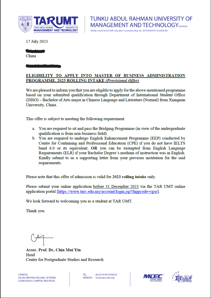 | 硕士 | 相关领域的学士学位并取得至少CGPA2.500或同等资格。 | 同上 | 同上 |